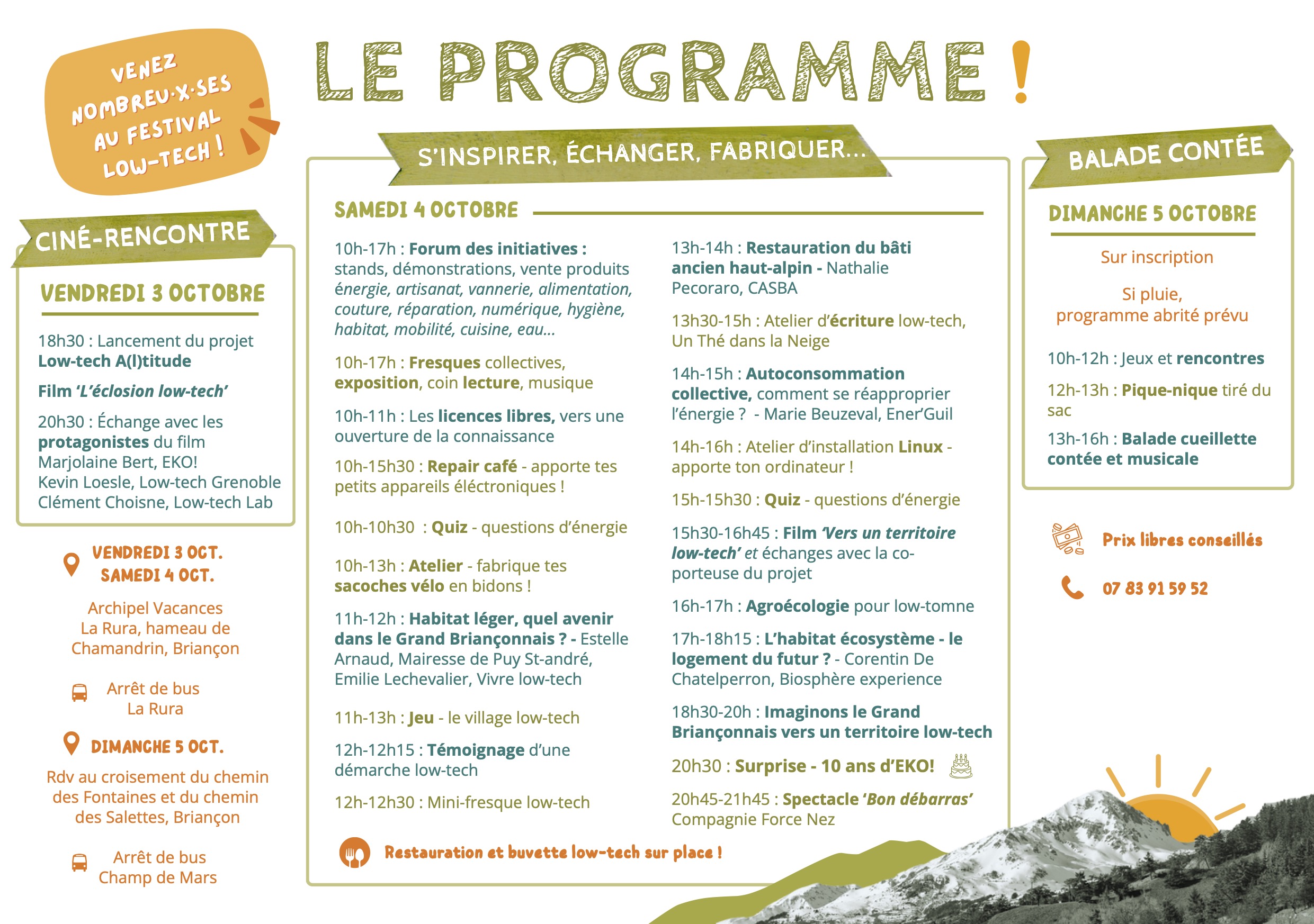 - Rencontres et échanges : conférences, tables-rondes, fresque collective, activités d’écriture et d’imagination de ce que serait un territoire low-tech, séminaire national annuel du Low-tech Lab accueilli à Briançon du 4 au 8 octobre